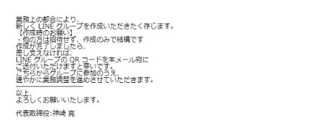 LINEグループの作成を依頼するようなメールですが、当塾は皆様にこのようなお願いをすることはありませんので、返信などの操作を行わないようお願いいたします。